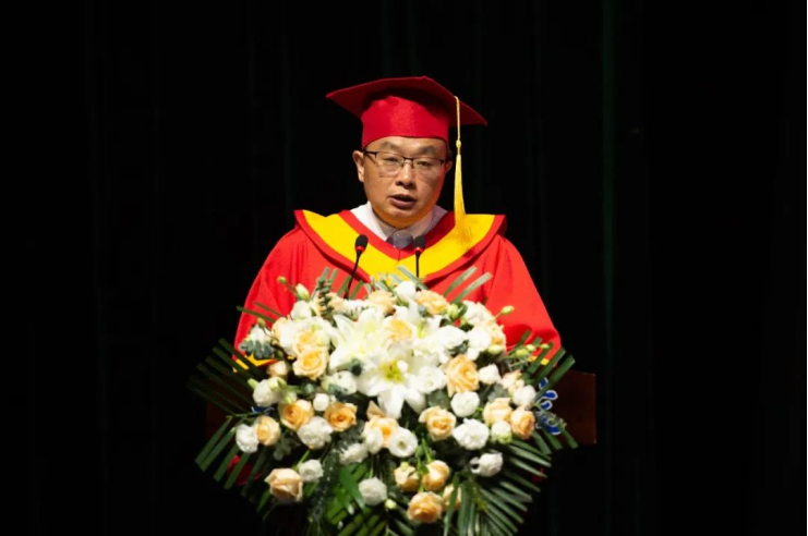 “每一段值得铭记的青春,始终是与祖国同向而行的青春,是挥洒汗水铸就的青春,是依靠学习走向未来的青春,是在平凡中孕育伟大的青春。”校长潘良明说。希望同学们以奋发之姿勇挑国家民族重任,与伟大的祖国一起奋斗、一起成长,为实现中华民族伟大复兴中国梦而不懈奋斗。希望同学们将“知行至善、厚积薄发”的校训精神内化于心、外化于行,坚守“追求卓越”的进取之心,将所学应用于实践,以“人一之、我十之,人十之、我百之”的奋斗姿态,在攀峰登高中奋勇前行,在攻坚克难中锤炼意志,在奋楫争先中成就自我。希望同学们在新的人生阶段,时刻增强知识更新的紧迫感,始终把学习作为立身做人的永恒主题,向他人学习、向世界学习,养成学贯中西的学识、胸怀天下的气魄、求真求善的质朴、善作善成的担当。希望同学们从“平凡”处起笔,投身社会的巨浪和时代的洪流中去,以平凡之心诠释坚守之志,在历史中留下“不平凡”的痕迹。