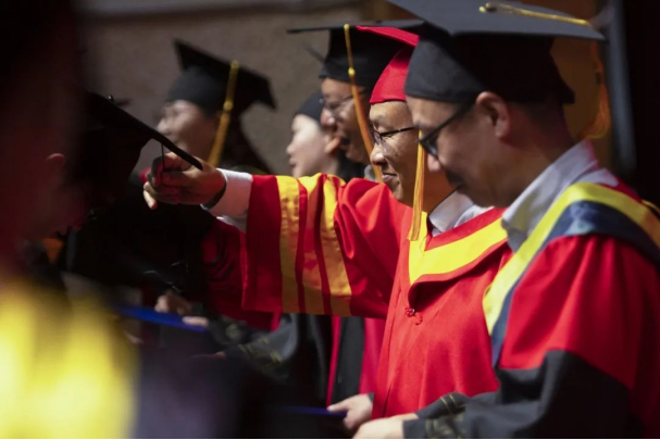 在学士学位授予仪式上,毕业生身着学士服依次走向主席台,接受校学位委员会扶正流苏、授予学位并合影留念。