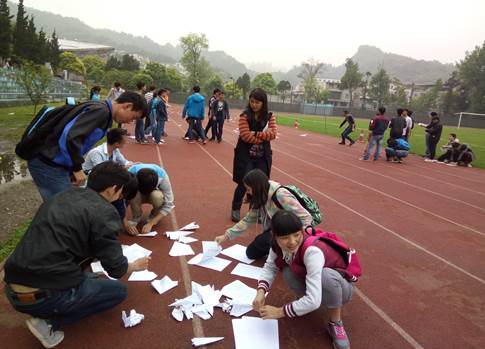 讲座的第二个内容是“做”,学习阵地由图书馆转移到田径场,引入优秀的团队执行力培训游戏——纸飞机比赛。通过分组、确定组长、优选教导员、小组讨论分工、飞行测试等多个环节,让参与的同学亲身体验团队的分工、协作所带来的工作效果。在此过程中,各组组长进行统筹,每个组员根据分工各司其职,尽力完成任务,场面紧张而刺激。这种寓教于乐的学习方式让同学们印象深刻,纷纷表示领悟到了:职责不分大小,每个人都应该尽职尽责做好自己该做的事;当我们发现问题时,不应“事不关己,高高挂起”,而应及时沟通,保证工作顺利推进,避免一些不良后果的出现。