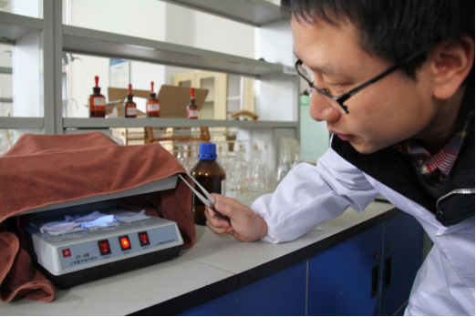 4月9日,贵阳晚报记者汤利来到我院,与best365化工学院教师柏松博士在一号实验楼进行实验,针对有专家指出消费者可使用带紫外线验钞机来辨别面膜中是否添加了荧光剂,探究紫外光是否能够检出面膜中含有荧光增白剂。