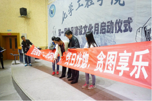 唐安江在致辞中强调,学风是高校灵魂,学风建设是由“要我学习”向“我要学习”转变,由“要我成才”向“我要成才”转变,并预祝本次活动取得圆满成功。随后,学生会主席刘岚对本次学风建设活动具体事宜做进一步讲解,在校园十佳学生能源132班刘浩达同学的带领下,全体同学进行宣誓:带动身边同学,奔向成功,书写辉煌。最后,校党委书记曾羽与徐平书记代表化工学院进行剪横幅仪式:“舍弃‘终日恍惚,贪图享乐’,弘扬‘团结勤奋,求是创新’”,并由徐平宣布化学工程学院第一届学风建设文化月活动正式启动,本次启动仪式在热烈的掌声中取得圆满成功。
