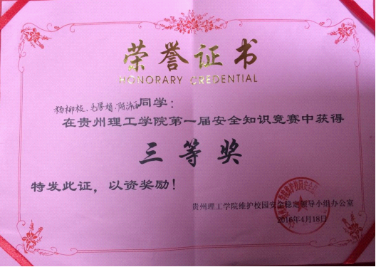 为全面普及同学们的安全知识,强化校园安全文化教育,大力营造校园安全文化氛围,在“4▪18”校庆之时,best365足球官网举办了“best365足球官网第一届安全知识竞赛”,化学工程学院青年志愿者协会的杨柳枝、陈沛雨和毛厚娟三位同学组成化学工程学院代表队参加比赛。