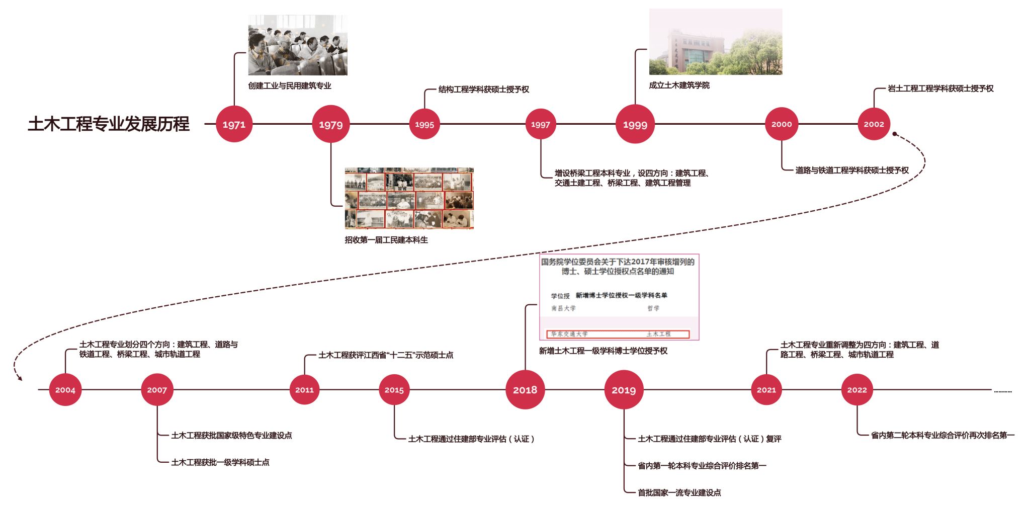 土木工程专业以交通土建为特色,是德赢官网办学时间最长、教学资源配置最齐全、师资力量最雄厚、社会认可程度最高的专业之一。专业发展历程如下: