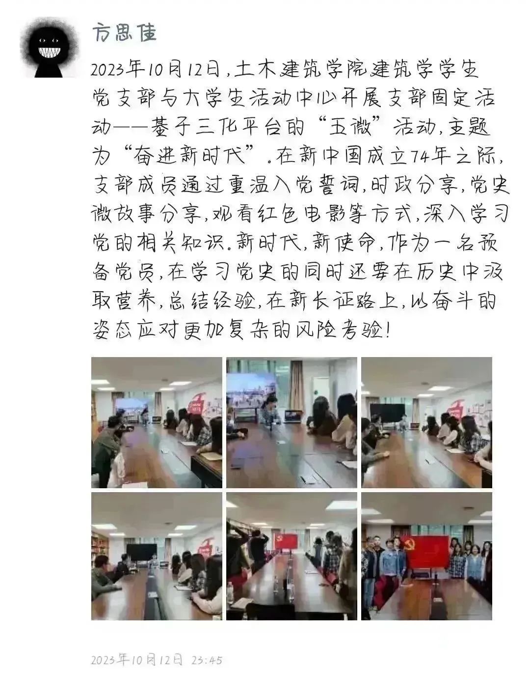 近日,建筑学学生党支部在三化平台开展一次以“奋进新时代”为主题的主题党日活动,活动内容主要有四项: