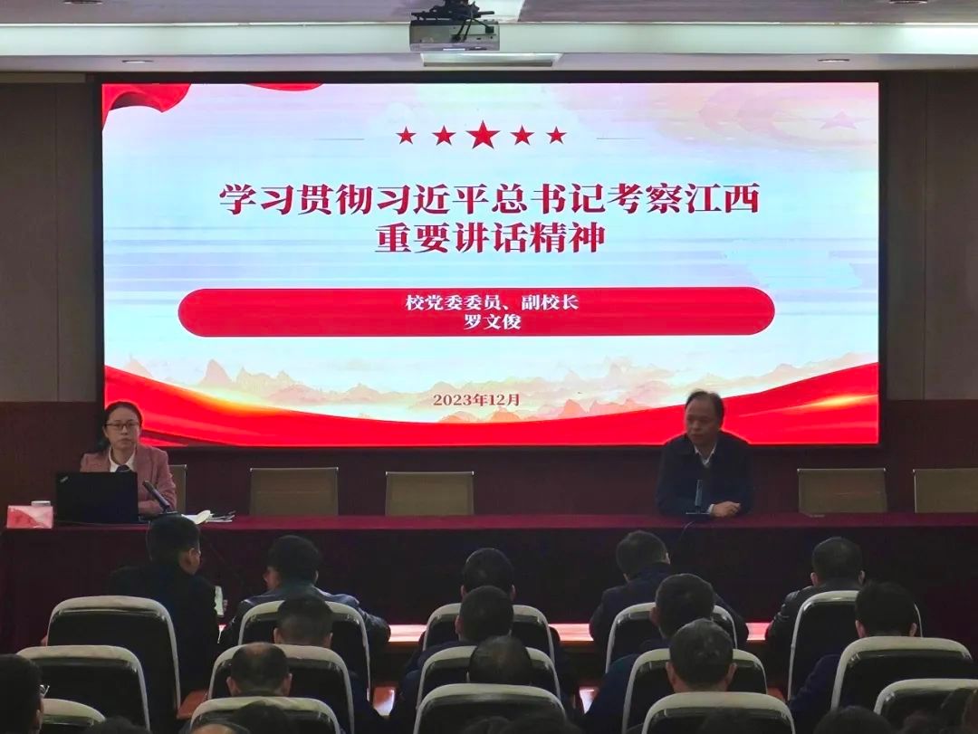 会上罗文俊副校长以对习近平总书记考察江西重要讲话精神四个问题的思考为引领,以江西实际情况为基础,带大家具体分析了总书记对江西发展的指示与要求。习近平总书记指出,“三大高地实施”“五大战略”的部署完全符合中央规划和江西实际,能完全体现时代要求、顺应人民期盼。对推进江西高质量发展方面,提出了“解放思想、开拓进取、扬长补短、固本兴新”十六字的重要指示。今年,习近平总书记在过去“五个推进”的基础上又提出了“4+1”的新要求,即努力构建现代化产业主系,深化对内对外开放,全面推进乡村振兴,扎实推进共同富裕,坚持和加强党的全面领导。