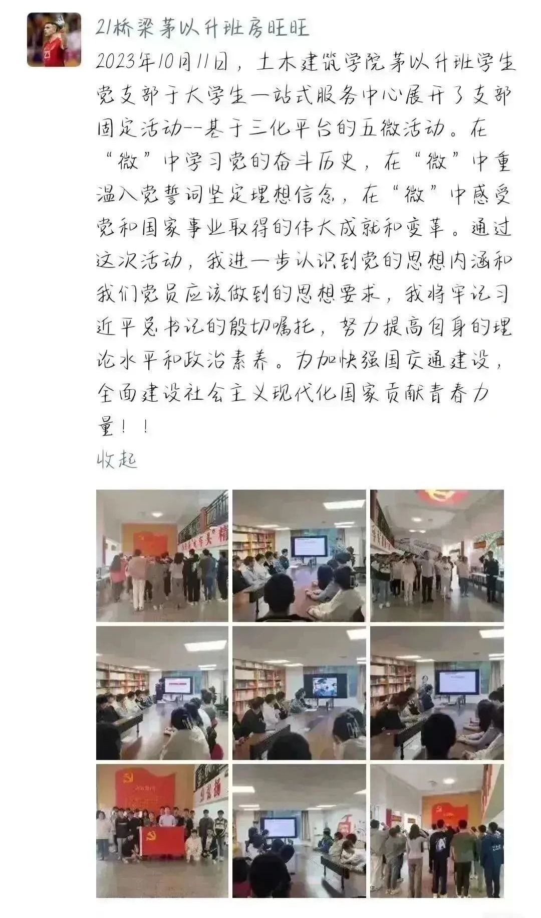近日,茅以升班学生党支部在三化平台开展以学习贯彻党的精神,踔厉奋进新的征程”为主题的党日活动,活动内容主要有五项: