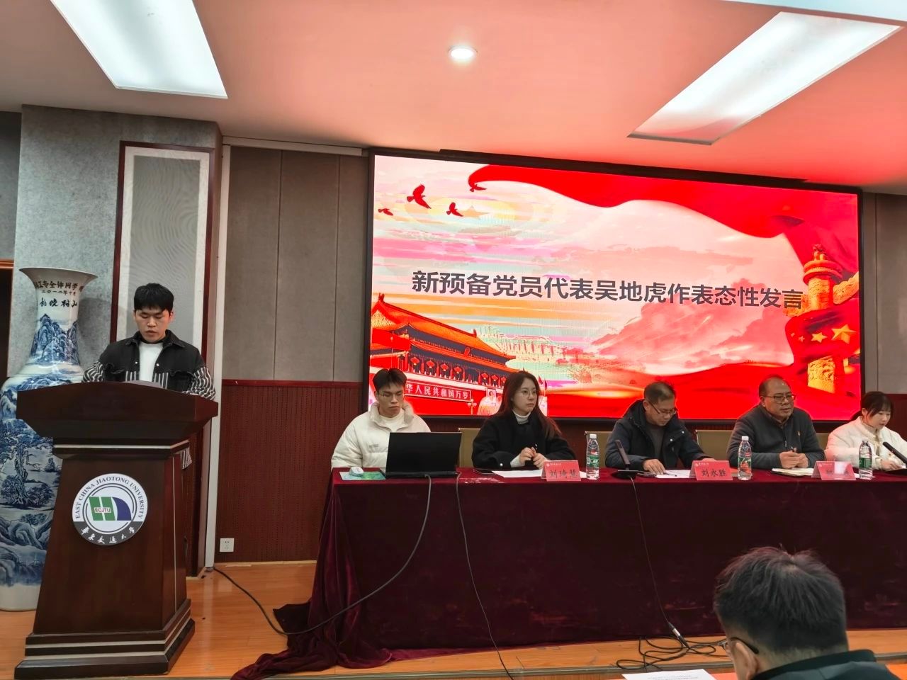 预备党员代表吴地虎与大家分享自己这段时期的学习收获,承诺坚定理想信念,加强理论学习,积极投身实践,发挥先锋模范作用,严守党的纪律,自觉接受监督,不断自我完善。