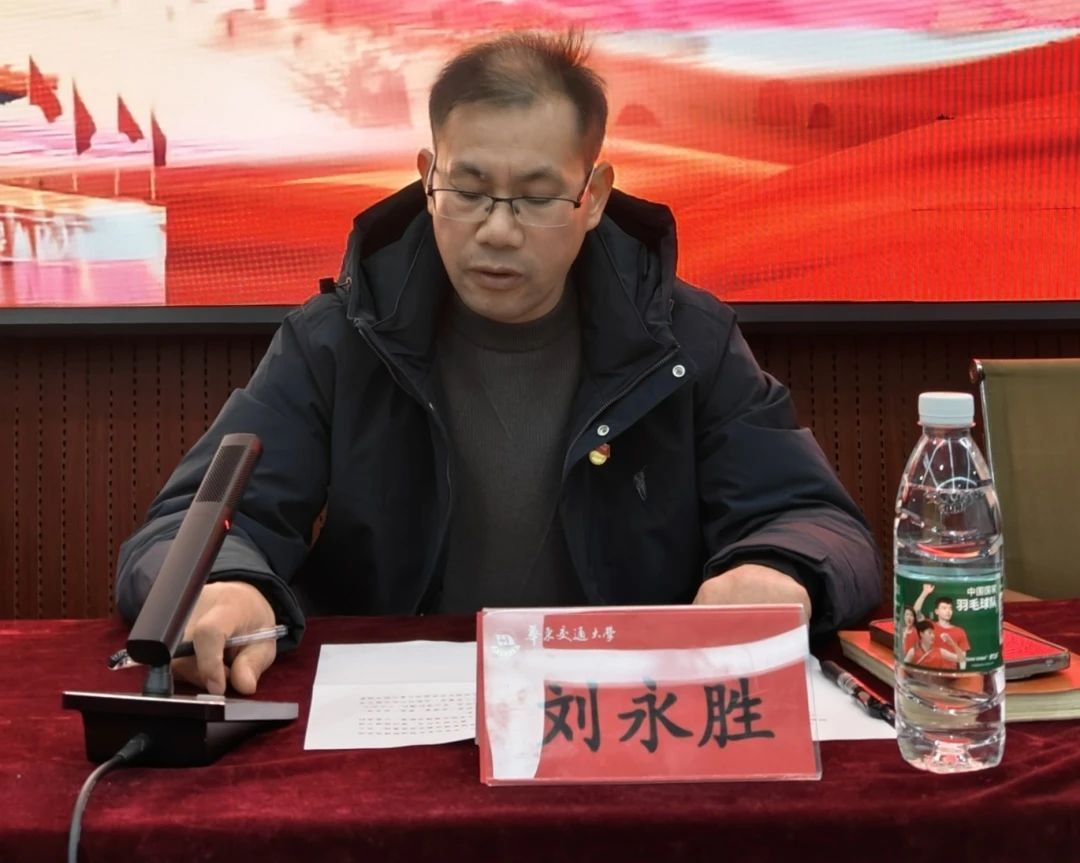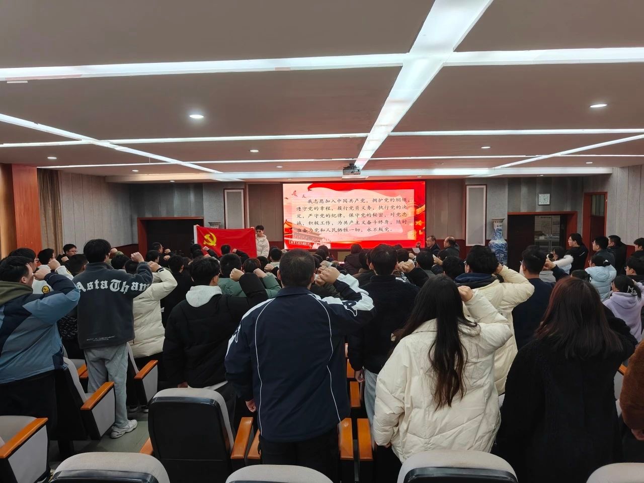 刘永胜书记带领新预备党员集体佩戴党徽、集体宣誓。宣誓结束后,他代表学院党委向预备党员表示热烈祝贺,并对新预备党员提出寄语。他强调,加入中国共产党是信仰的坚守与传承,希望各位同志深刻领悟党的光辉历史,坚定信念,展现党员的良好形象与风范。在学习和工作中发挥先锋模范作用,勤奋刻苦,勇于探索创新,为实现中华民族伟大复兴的中国梦贡献自己的青春力量。
