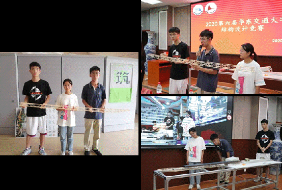 该组成员分别是:易钰清、郑思源、刘玥,该组采用梯形截面,通过测试发现问题,在承重比较大的地方加了连杆增加模型的抗压能力。他们提到之前的模型由于高度过高会出现侧翻所以在容易侧翻的地方加连杆。在加载过程中该组员对加载块谨慎摆放,一丝不苟,最后该组模型顶推成功,评委老师也进行了认可。