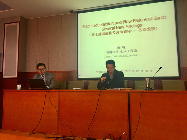 2016年12月30日15:00,应德赢官网vwin德赢ac米兰官方网和徐长节教授邀请,香港大学终身教授杨峻教授在vwin德赢ac米兰官方网200报告厅做了主题为《Static Liquefaction and Flow Failure of Sand: Several New Findings》“砂土静态液化和流动破坏:一些新发现”的学术报告。vwin德赢ac米兰官方网徐长节教授、郑明新教授、刁心宏教授、卢华喜副教授、耿大新副教授等多位教师及岩土所全体在校研究生参加了此次报告会,报告会由徐长节教授主持。