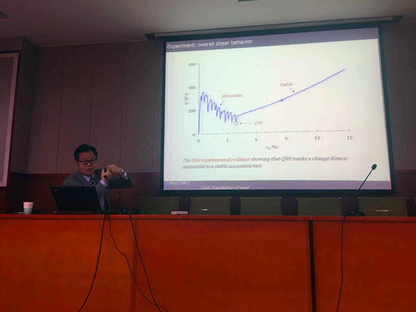 报告开始,杨峻教授首先结合自身求学经历,介绍了香港大学的办学历史及孙中山、张爱玲等知名校友。然后,杨峻教授针对砂土液化的基本概念、研究历程及国内外研究现状进行了详细阐述。紧接着,杨峻教授结合自身研究成果,介绍了微观作用下的砂土液化表征,阐述了液化过程中的准稳态及稳态的发展规律。最后,杨峻教授详细展示了微观颗粒特性对砂土应变软化过程的影响,颗粒尺寸、形状对砂土液化的影响以及考虑组构影响的砂土液化特性等方面的最新学术成果。