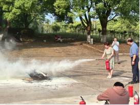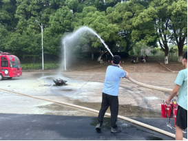 演练过程中,保卫处蒋瑨老师向师生示范了干粉灭火器、消火栓的使用方法以及注意事项。他讲述使用灭火器“提、拔、握、压”四个步骤,以及强调在使用灭火器时需注意对准根部、算准风向和保持有效距离。