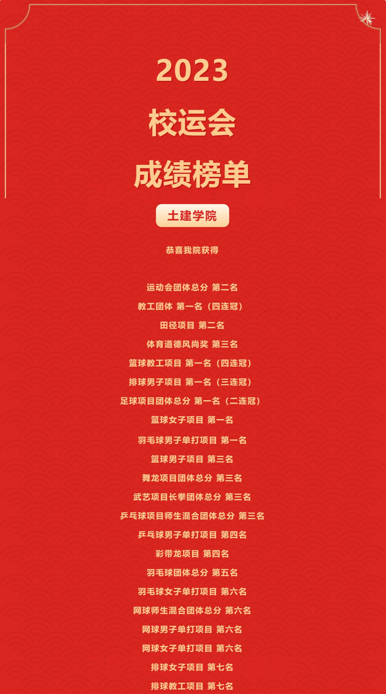 奋楫扬帆,继往开来;一分耕耘,一分收获。成绩的取得,离不开学院领导的重视和关心,更离不开土建运动员们的刻苦训练和荣院情怀,也离不开广大师生背后的默默付出和大力支持。德赢官网全体师生将以此次校运会取得的优异成绩为新的起点,踔厉奋发,砥砺前行,为优化体育赋能人才培养模式和促进学院体育文化建设而不懈奋斗!也希望每一位土建运动员继续奋勇向前,勇于追梦,勇攀新高。我们,明年,再创辉煌!