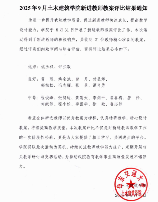 与此同时,学院还开展了教案评比活动,旨在通过评比帮助新进教师快速提升教学设计能力,尽快适应教学岗位。评委从多个维度对教案进行了细致审阅和综合评估,评选出了优秀、良好及中等三个等级教案。