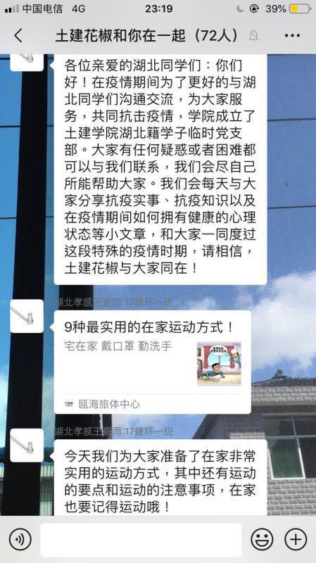 在湖北籍临时党支部的联系群中,党支部对湖北籍学生积极引导,分享有效实用的运动方式和心理辅导文章,全方位注重湖北籍学生的身心健康。同时结合自身锻炼经验,为同学们提了一份居家锻炼指南。同学们也按照健身建议每天打卡平板支撑、宽距俯卧撑、仰卧起坐、深蹲等锻炼,用积极行动展现战胜疫情的信心。