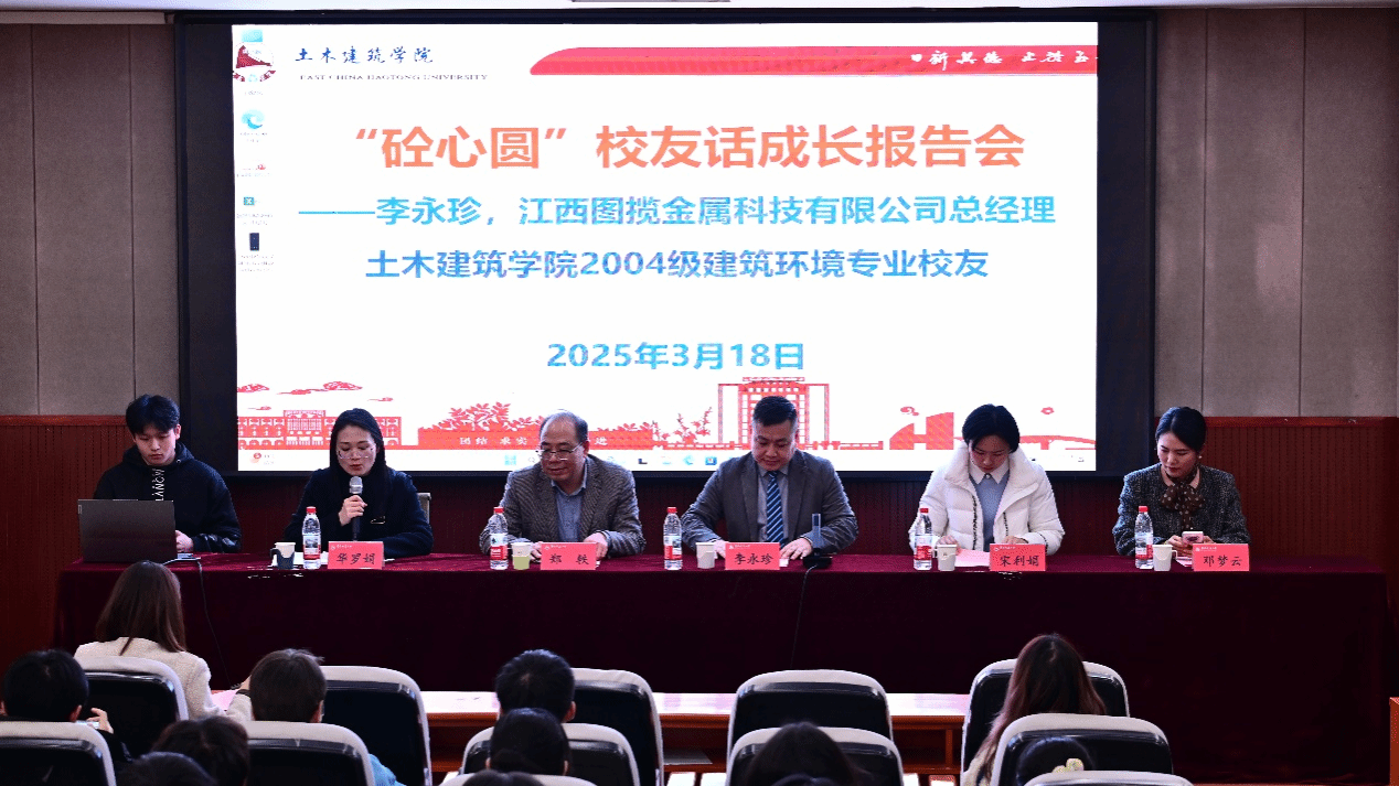 3月18日下午,德赢官网邀请2004级建环专业校友、江西图揽金属科技有限公司总经理李永珍,在教9栋200报告厅举行“砼心圆”校友话成长报告会。江西图揽金属科技有限公司综合部经理宋利娟、销售部经理邓梦云,土建学院党委副书记郑轶、学工办主任万雯怡及2024级学生代表参会,报告会由学工办副主任华罗娟主持。