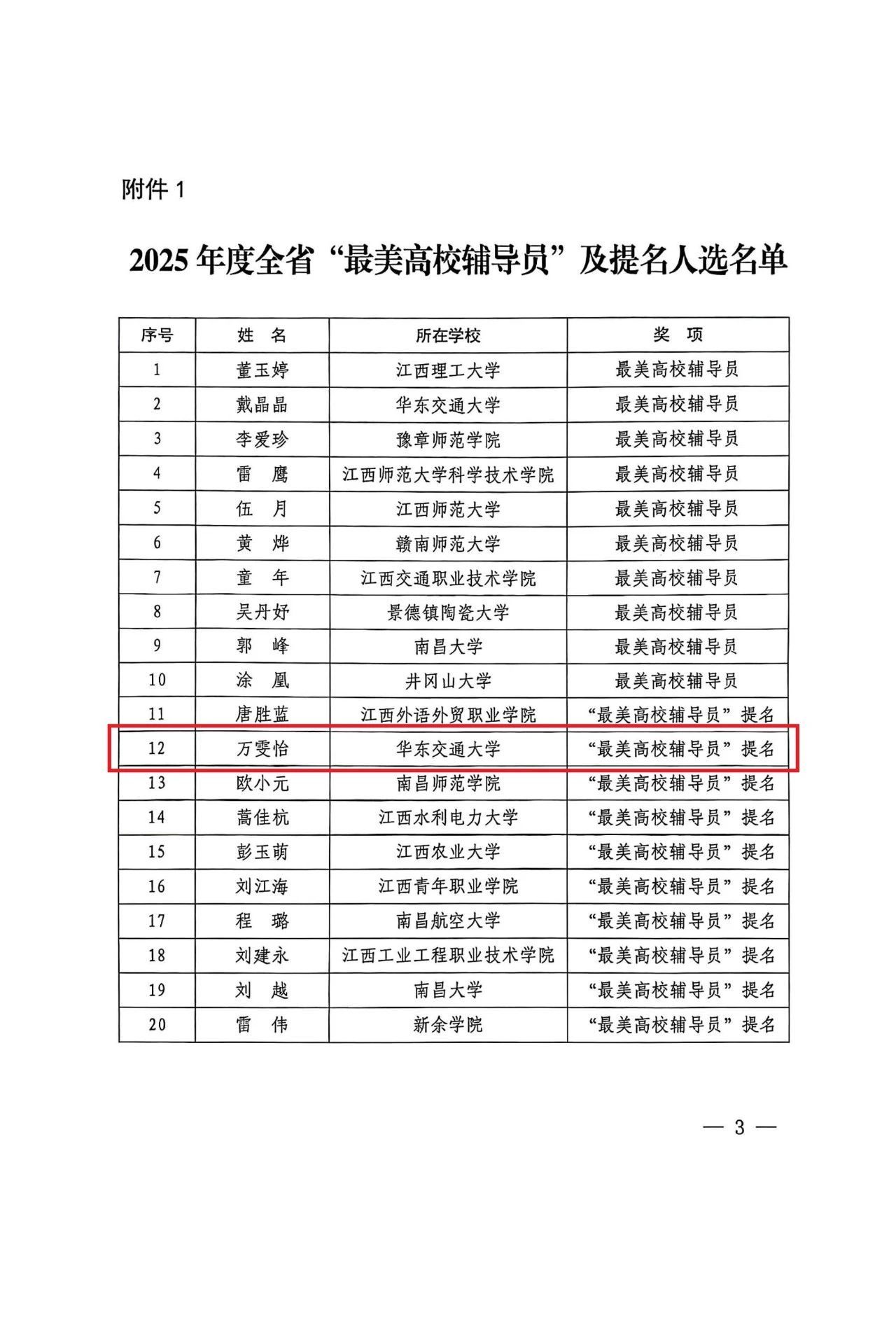 近日,中共江西省委宣传部和江西省教育厅联合发文公布2025年度全省“最美高校辅导员”“最美大学生”推选结果,德赢官网学工办主任兼团委书记万雯怡老师荣获全省“最美高校辅导员”提名。这是德赢官网在全省“最美高校辅导员”评选中的首个奖项,这一荣誉不仅是对万雯怡老师坚守辅导员岗位潜心育人的充分肯定,也是德赢官网扎实推进辅导员队伍建设的生动体现。