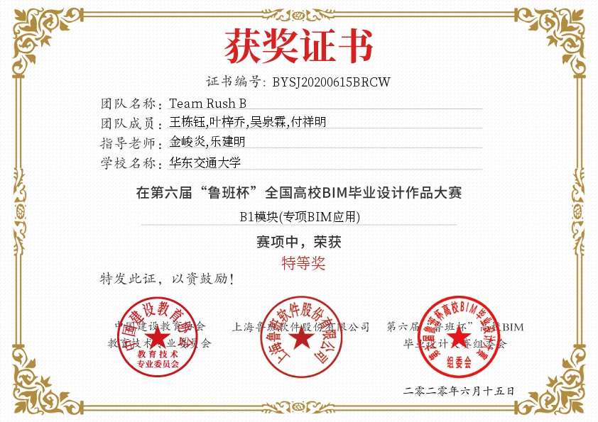 2020年6月13日上午,第六届“鲁班杯”全国高校BIM毕业设计作品大赛正式落幕。由vwin德赢ac米兰官方网金峻炎和乐建明老师指导,来自工程管理专业的王栋钰、吴泉霖、付祥明、叶梓乔同学组成的“Team Rush B”团队经过和西南交通大学、中国海洋大学、兰州交通大学、云南大学等200余所高校、近500多支参赛队伍的激烈的比拼角逐,最终获得了本次大赛的特等奖,并赢得了价值40000元的软件使用权。