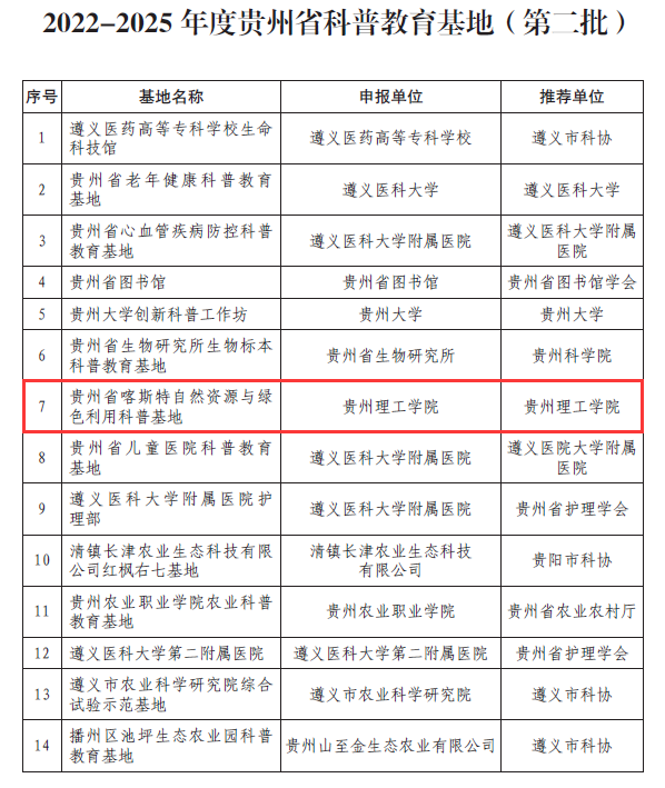 日前,在贵州省科学技术协会主办的贵州省科普教育基地联盟成立大会上对获得2022—2025年度贵州省科普教育基地的42家单位进行了授牌,best365足球官网组织申报的“贵州省喀斯特自然资源与绿色利用科普基地”名列其中。该科普基地由学校科技处指导,资源与环境工程学院牵头,联合矿业工程学院、材料与能源工程学院(贵州省轻金属材料制备技术重点实验室)、化学工程学院、航空航天工程学院、创新创业中心等多部门联合申报。