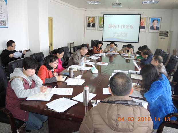 本网讯(蓝文思、张建军供稿)2016年3月4日下午2:00,马列主义教学部召开了新学期工作部署会议。马列部王忠奎副书记主持了会议,就新学期教学、科研等工作进行了安排。