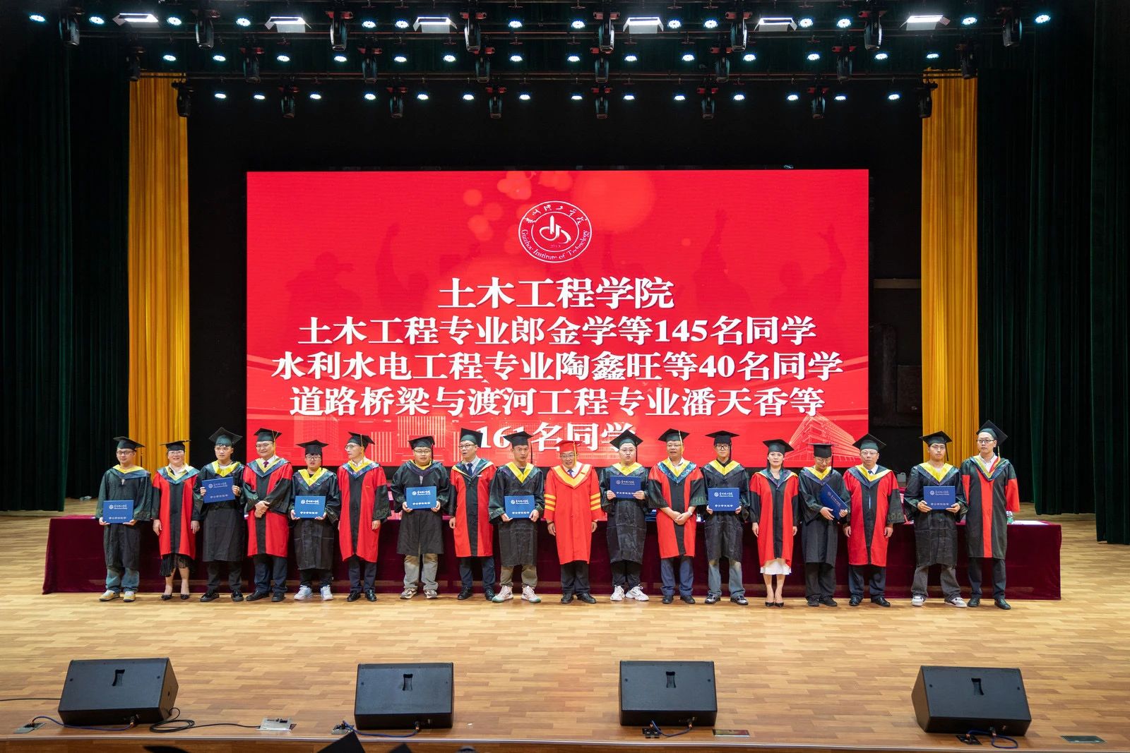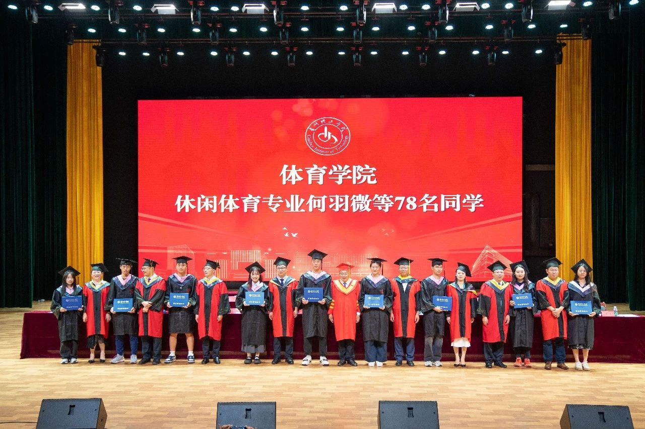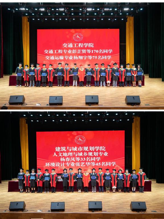 在学士学位授予仪式上,毕业生身着学士服依次走向主席台,接受校学位委员会扶正流苏、授予学位并合影留念。
