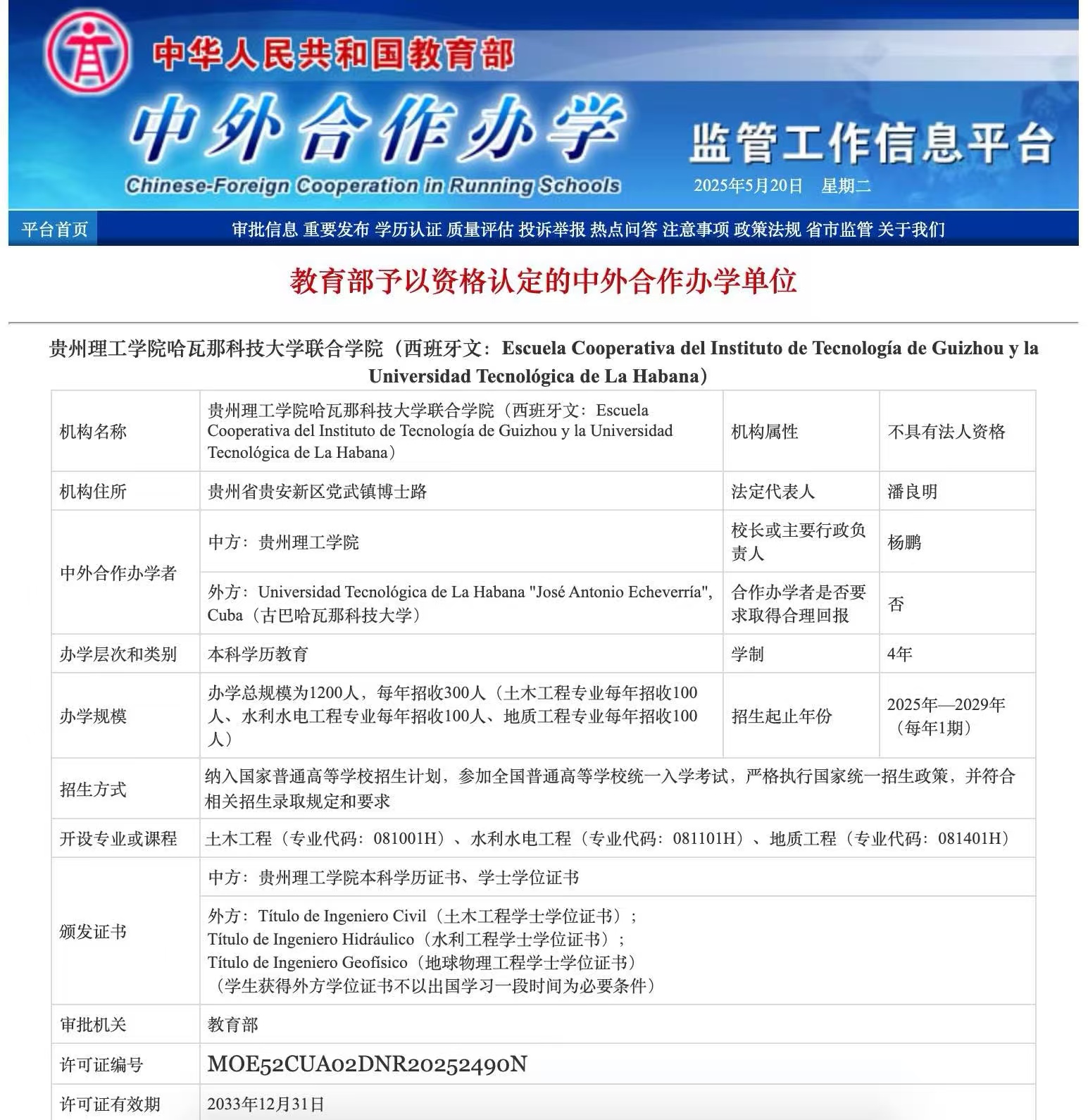 近日,教育部中外合作办学监管工作信息平台传来重磅喜讯:best365足球官网与古巴哈瓦那科技大学合作设立的best365足球官网哈瓦那科技大学联合学院正式通过教育部资格认定,成为学校首个获教育部批准成立的中外合作办学机构,是中拉首批工程类合作办学机构,也是全国为数不多用西班牙语授课的工程类中外合作办学机构,为中拉文明互鉴与科技教育融合开辟了全新路径。