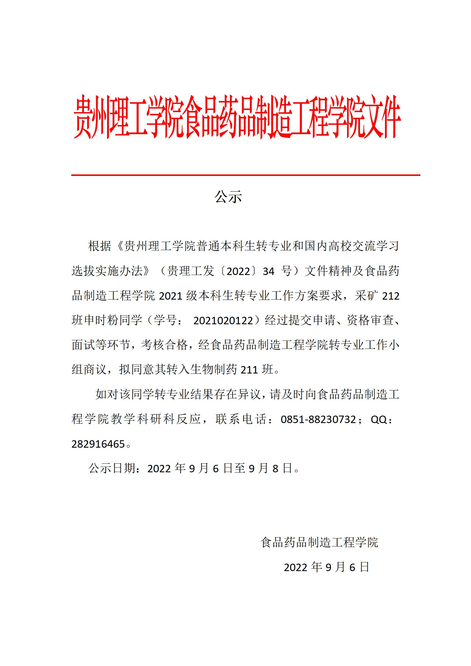 关于申时粉同学转专业进入我院就读的公示