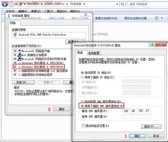4、左键单击“Internet协议版本4(TCP/IPv4)”,选择“使用下面的DNS服务器地址”,在“首选DNS服务器”中输入“202.98.192.67”。最后,依次左键单击两个“确定”,完成设置。(图4)