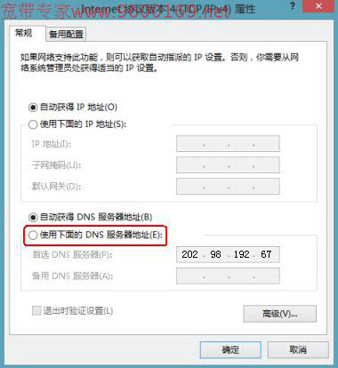 服务器地址“,在“首选DNS服务器”中输入“202.98.192.67”。最后,依次左键单击两个“确定”,完成设置。(图3)